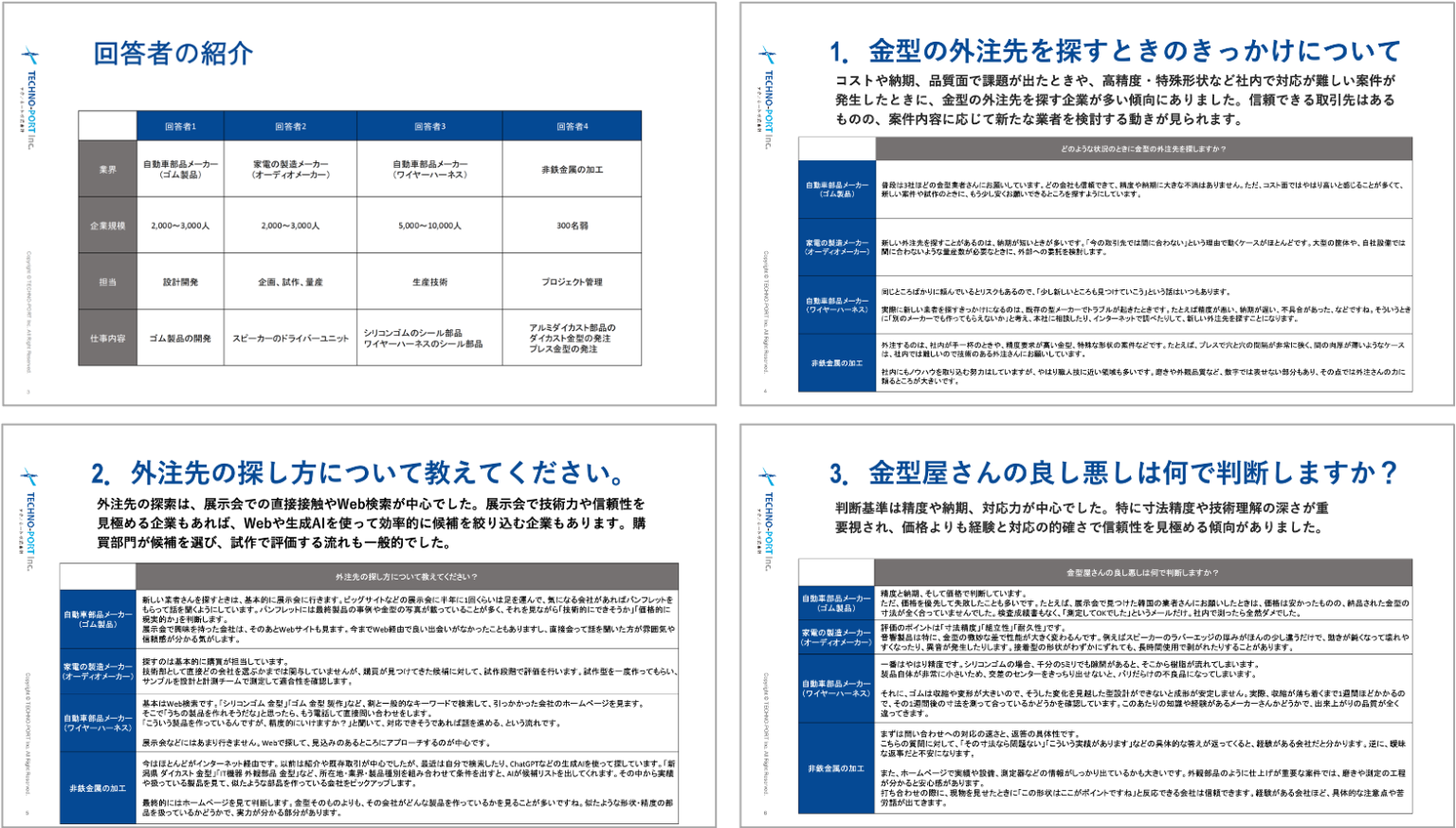 メーカーの担当者が新規で金型発注先企業を探索する際の背景、探索方法、ホームページのどこを見るか、選定基準など、全8項目にわたるインタビューを実施いたしました。