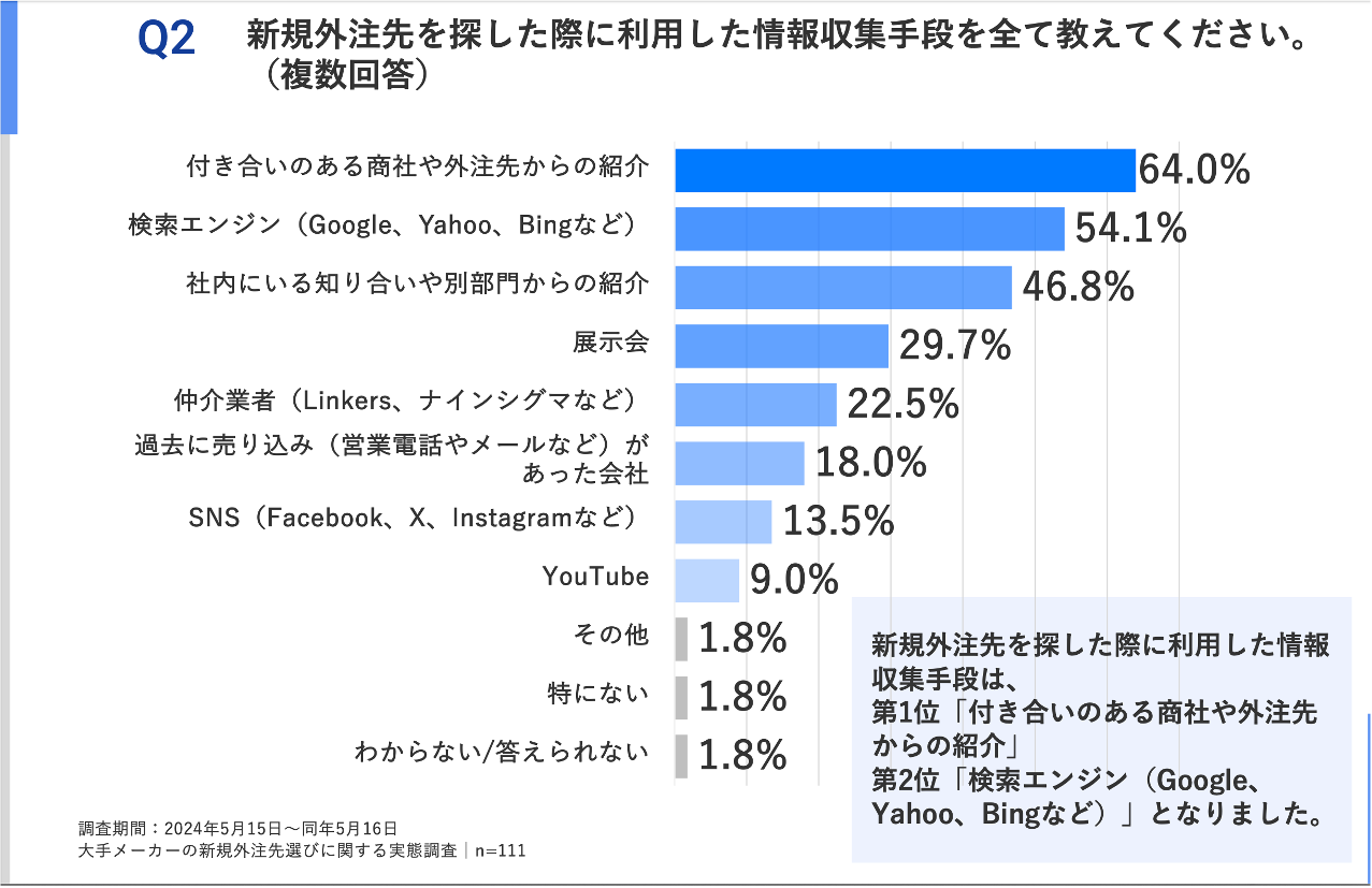 既存の商社や付き合いのある外注先以外の会社を探す際の情報収集の手段として、Webを使うユーザーが圧倒的に多いことが証明されています。