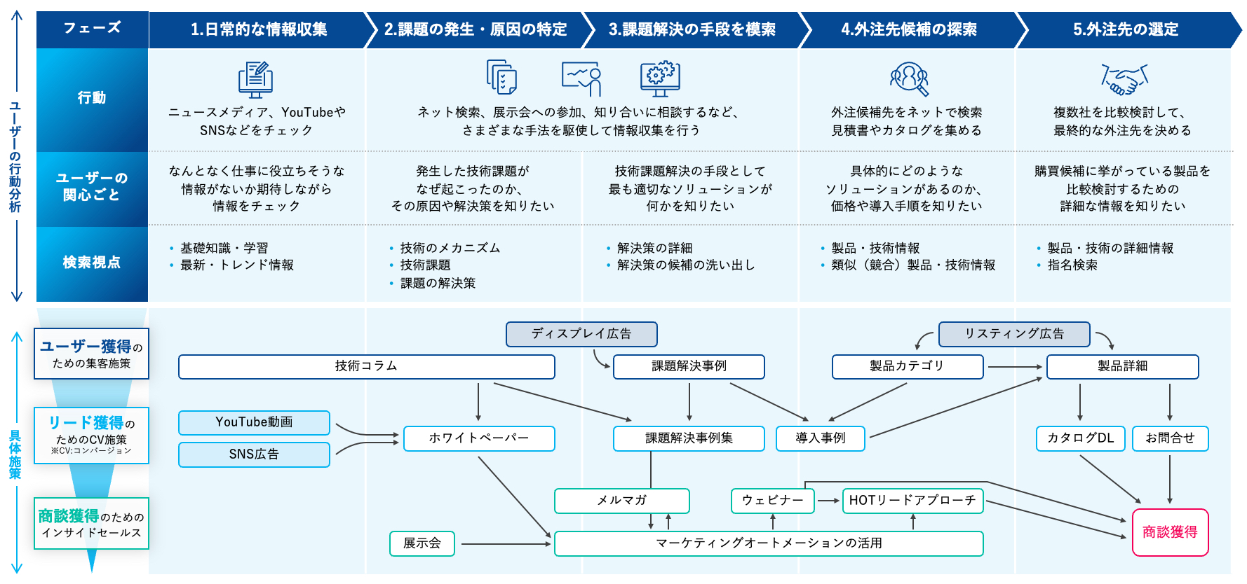 製造業の集客では、ユーザーがどんな流れで情報を探し、外注先を決めていくのかを理解しておくことが非常に重要です。