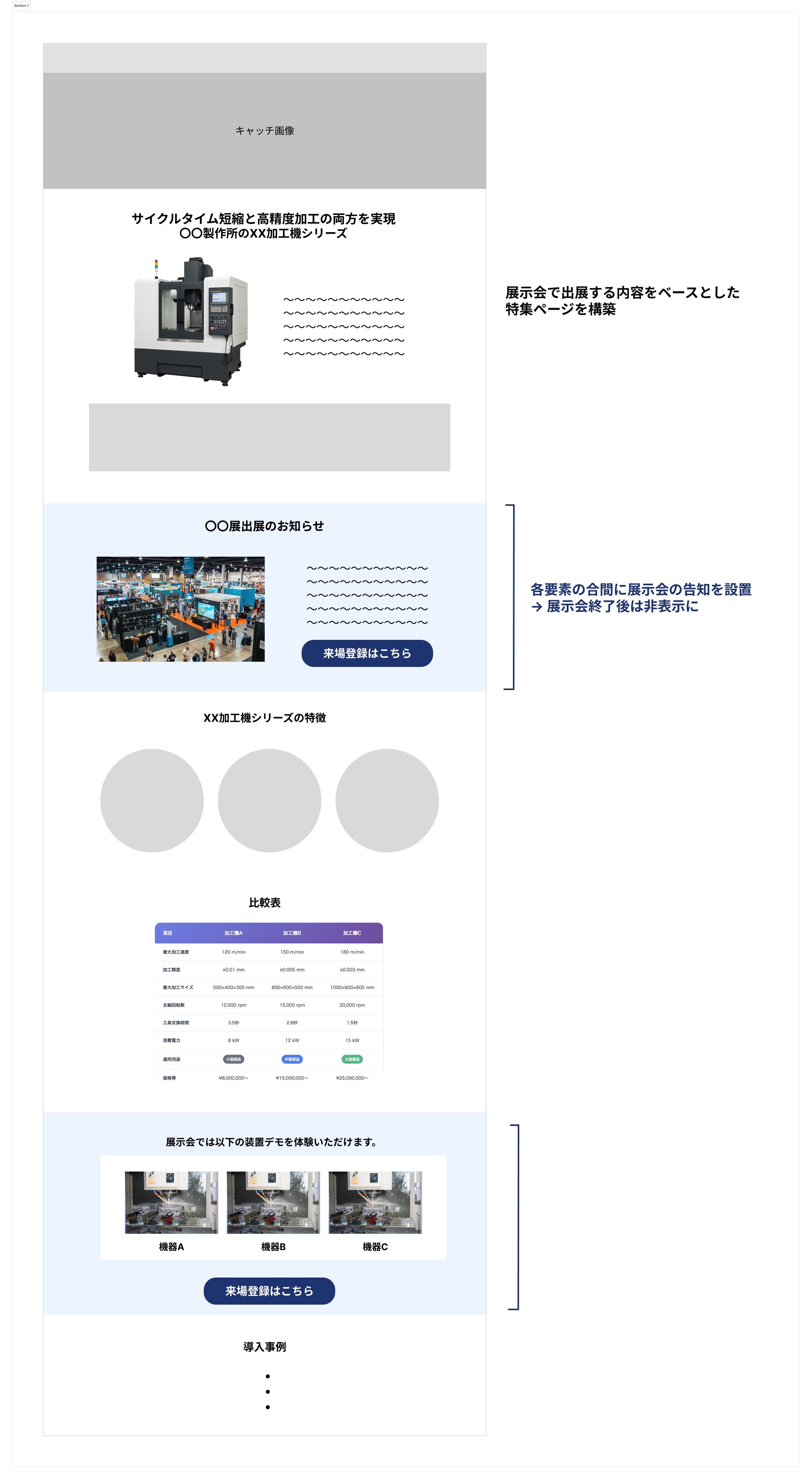 告知用LPとしては展示会の内容をメインとして冒頭から展示会概要、出展物詳細…と構成を組んでいくことが多いかと思いますが、おすすめとしては「展示会で出展する技術・製品をベースとした特集ページを構築する」という前提で全体の構成を組み、その合間に展示会の告知を挟んでいくスタイルです。