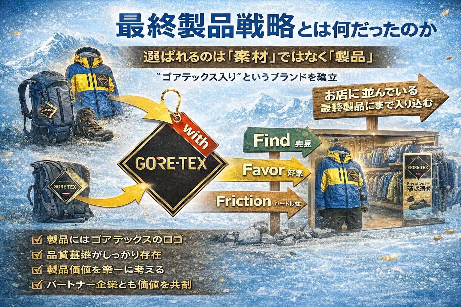 ゴアテックスは、ブランド側から販売現場に深く入り込みました。どう売るか、どう説明するか、どんな展示をするか。販売の仕組みそのものを設計しています。素材メーカーなのに、最終製品の売られ方まで気にしている。これも、考えてから動いたというより、動きながら最適化していった結果です。