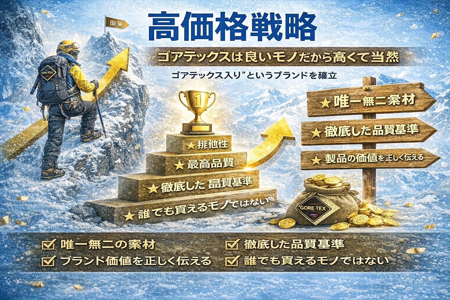 ナンバーワンであることを示し、最終製品として振る舞い、その上で高価格を貫く。3点が揃ったことで、ゴアテックスは価格競争とは無縁のポジションを確立しました。