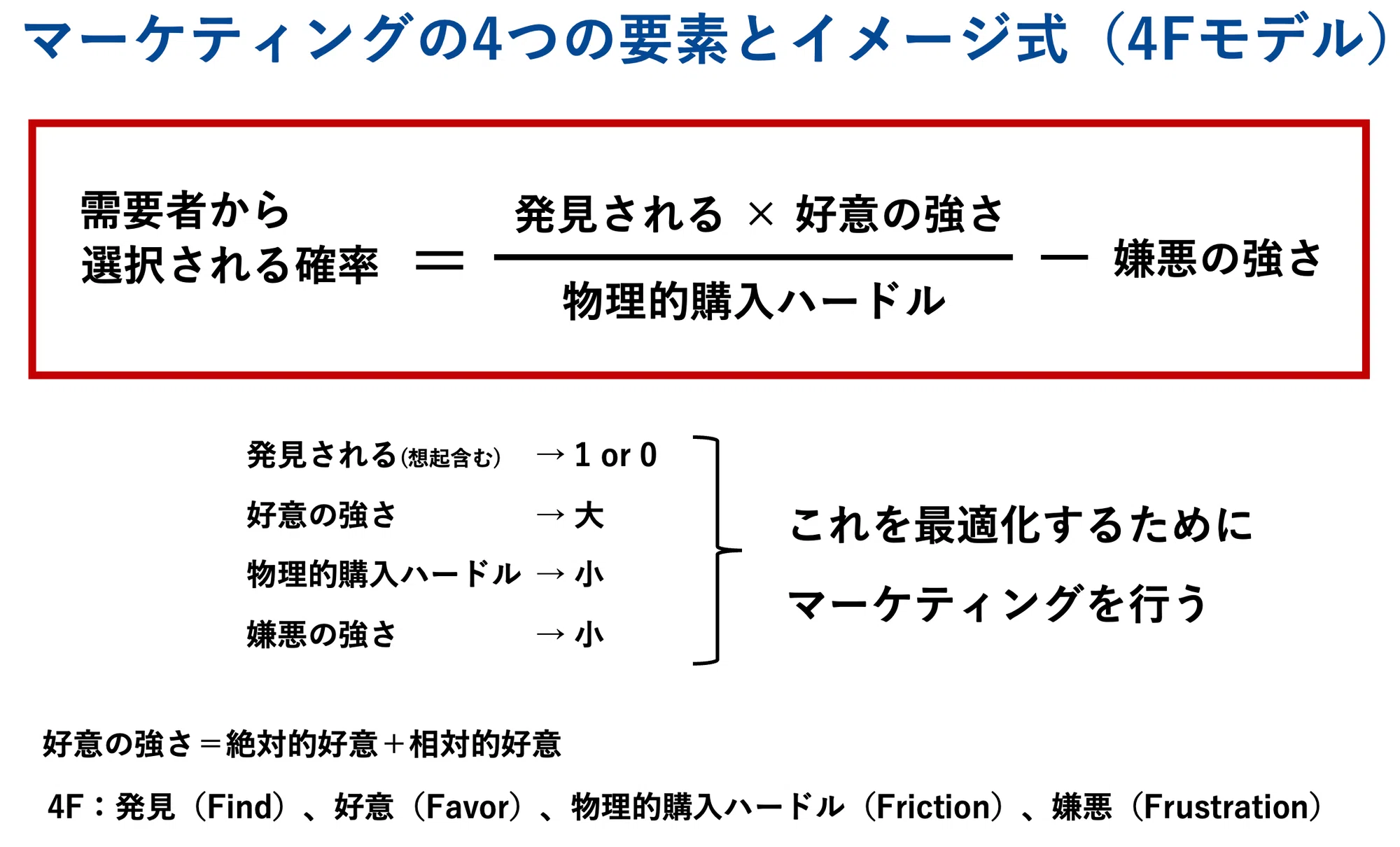 マーケティングを構造的に捉えると、需要者から選択される確率は、発見されるかどうか、好意の強さ、物理的な購入ハードル、嫌悪の強さという4つの要素の組み合わせで決まります。この枠組み自体は、業界が変わっても共通です。