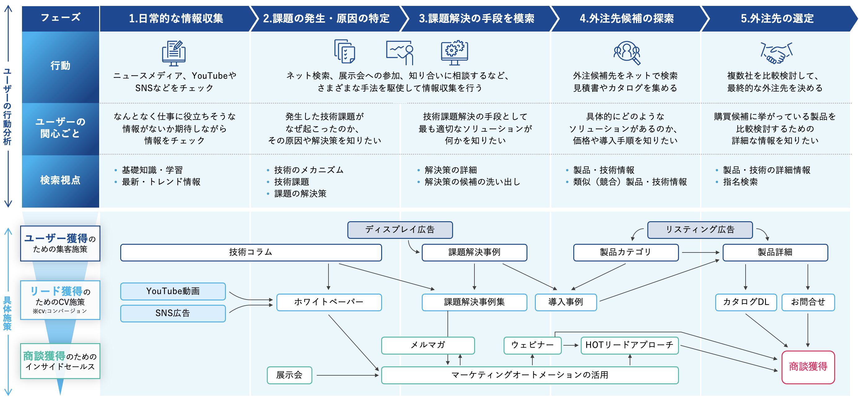 技術理解が前提になるもう一つの理由は、Webマーケティングの施策設計そのものにあります。SEO、コンテンツ、ホワイトペーパー、導入事例といった施策は、すべて「どの段階の理解を前に進めるのか」を意識して設計されます。技術の構造や業界特有の課題を理解していなければ、どの情報を、どの順番で出すべきかを判断できません。