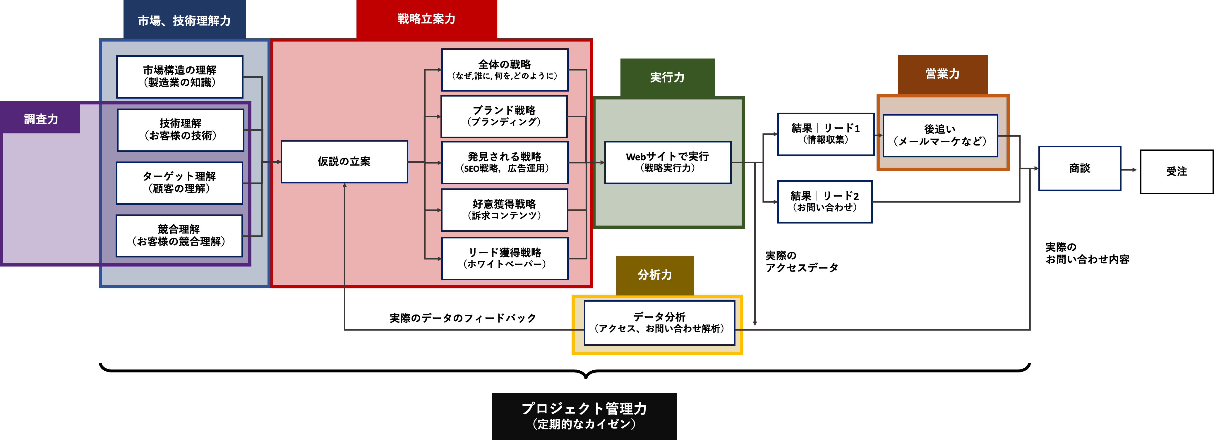 こうした体制とプロセスの組み立ては、単発のWeb施策ではありません。技術理解を前提にしたマーケティング戦略、情報設計、実行体制、データ分析、改善サイクルが、一貫した設計思想として機能しています。結果として、Webサイトは単なる情報発信装置ではなく、理解・比較・意思決定のための包括的なインフラとして成立しています。